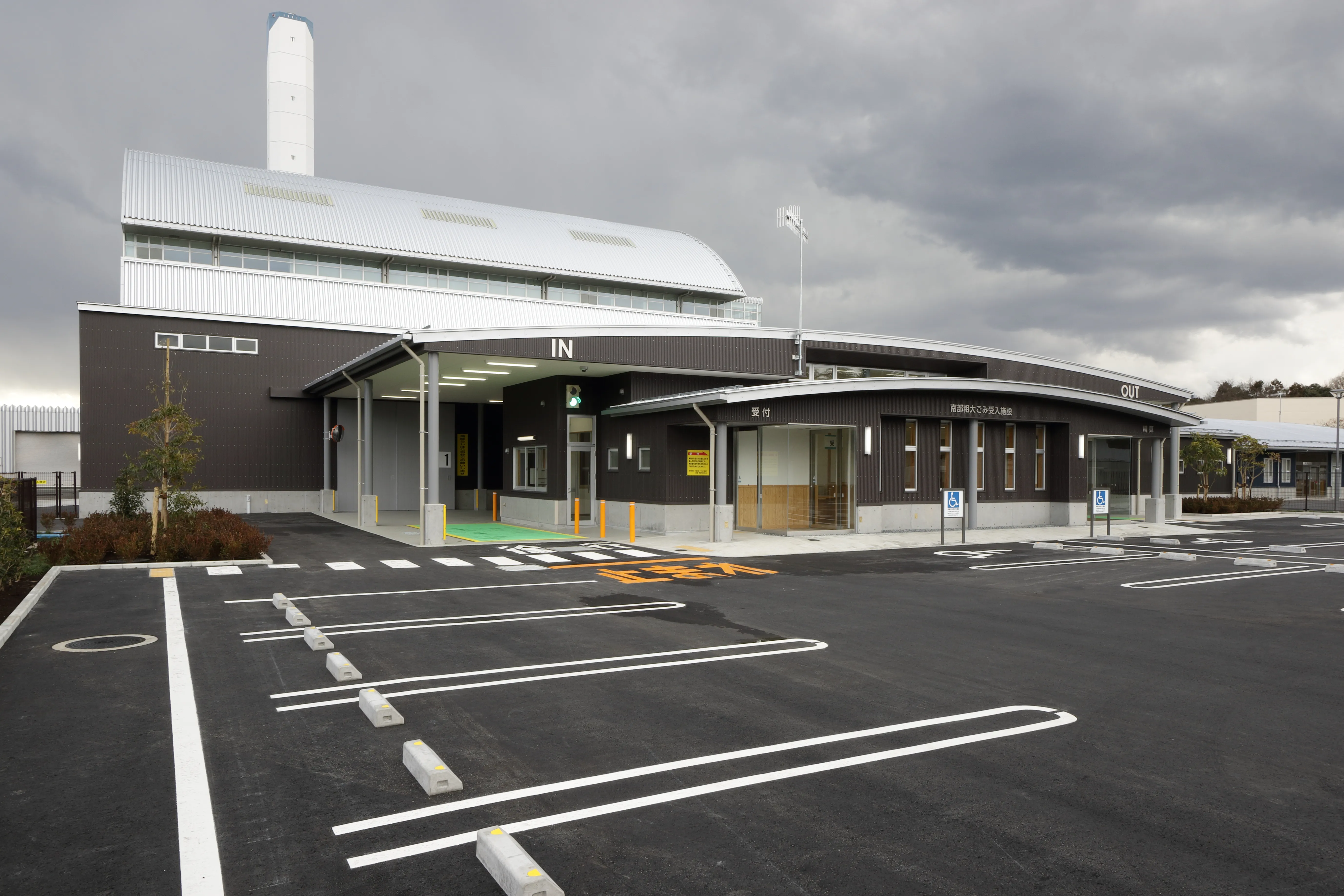 この建築は、車両等で持ち込まれた粗大ごみを計量し、支払い手続きを行う事務所棟と、受け入れた粗大ごみを一時保管しリペア品と廃棄品を分別する倉庫棟で構成される